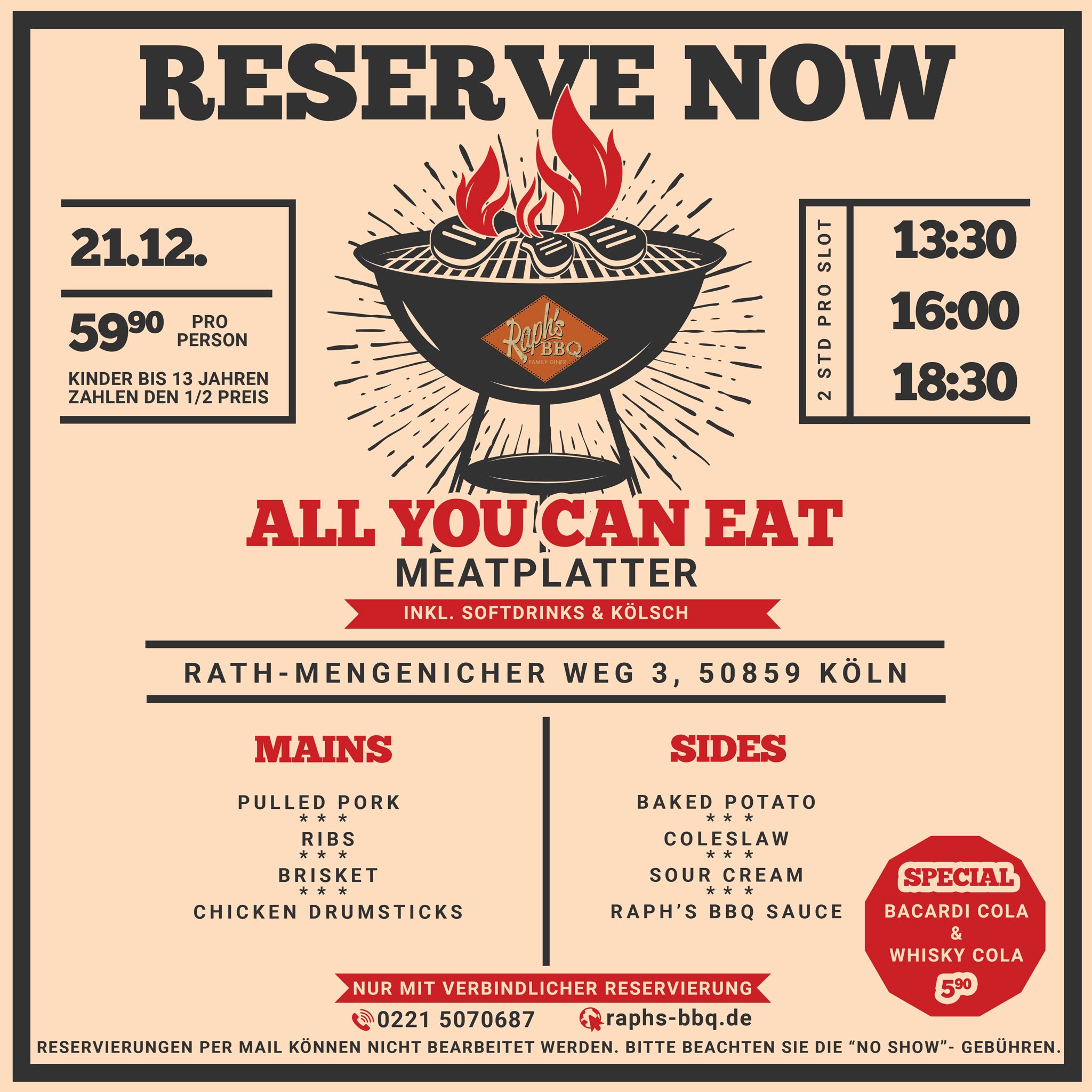 Du liebst BBQ? Dann ist unser ALL YOU CAN EAT – Meatplatter genau das Richtige für dich! Genieße 2 Stunden lang saftiges Pulled Pork, Ribs, Brisket und Chicken Drumsticks. Dazu gibt’s Baked Potato, Coleslaw, Raph’s BBQ Sauce und Sour Cream.